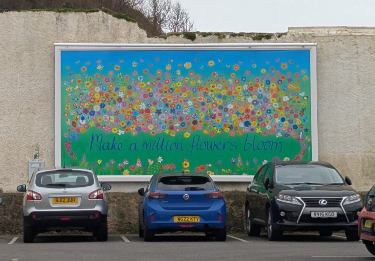 The Million Flowers Community Artwork poster is displayed on the Wallspace billboard in the carpark by the swimming pool. Sidmouth School of Art’s Wallspace billboard is a public gallery for everyone. The billboard is a platform to grow confidence, share ideas and create interest: a community space: intriguing, fun and curious.